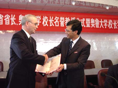 谭世贵校长向奥鲁省省长艾诺.苏利安南先生颁发名誉教授聘书