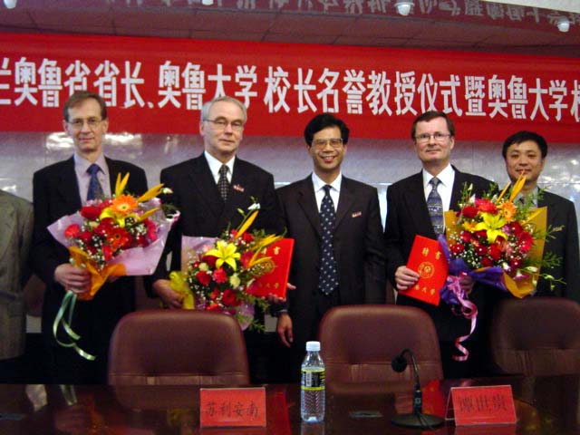芬兰奥鲁省省长一行与谭世贵校长和史贻云副校长合影