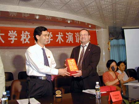 仪式结束后,佩皮尼昂(Perpignan)大学校长佛飞(François Féral)教授做了题为“世贸组织内国际贸易法律原则与国家经济主权”的学术演讲,他以一位法学教授的观点对世贸组织的法则法规进行了深入浅出的阐述。副校长康岱(Michel Cadé)教授做题为“当代史起源电影的利用”的学术演讲,康岱(Michel Cadé)教授本人就是法国Confrontation 电影节的主席,他就法国电影历史的发展对社会的影响进行了详细的阐述。两位校长的演讲精彩纷呈,不时获得与会师生的阵阵掌声。演讲结束后,谭世贵校长向佩皮尼昂(Perpignan)大学校长佛飞(François Féral教授)和副校长康岱(Michel Cadé)教授赠送了纪念品,佩皮尼昂(Perpignan)大学校长回赠了礼品并对我校的热情接待表示感谢。