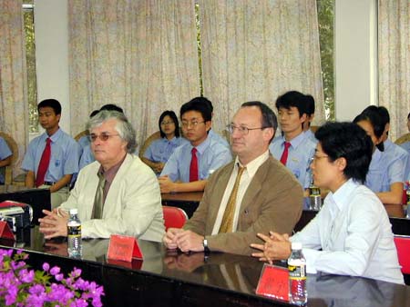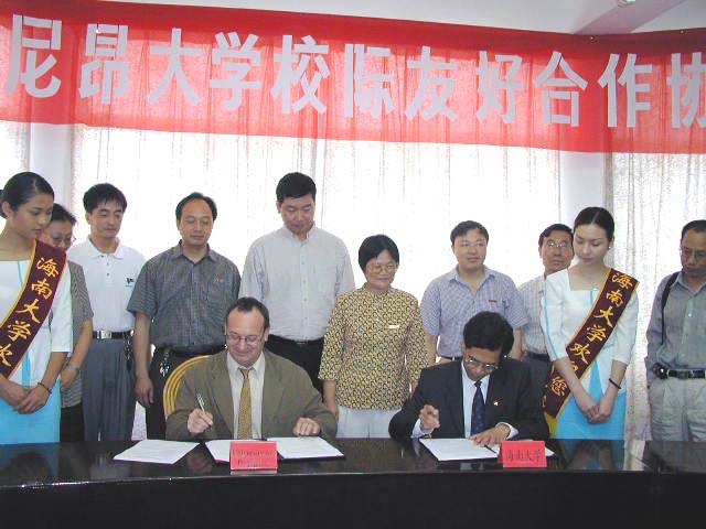 谭世贵校长代表我校与法国佩皮尼昂大学校长佛飞(François Féral)教授签署了《中国海南大学与法国佩尼皮昂大学校际友好合作协议》。谭校长向来宾简要介绍了海大各学科的分类及师生的情况,表示我校将在下学期开设法语选修课,为我校学生赴法学习提供必要条件。副校长林强教授主要介绍了我校科研方面的一些进展。佛飞(François Féral)教授向我校领导介绍了佩皮尼昂大学理学院的学科设置及重点实验室,副校长康岱(Michel Cadé)教授则介绍了人类学院的一些基本情况。