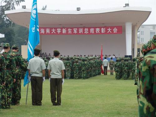 “立正”、“稍息”、“正步走”、“跑步走”……随着教官们短促有力的口令,我校2004级新生在教官的带领下一丝不苟做着动作,这是9月16日下午发生在我校新生军训总结表彰大会上的一幕,2004级新生以昂扬的斗志、饱满的精神接受了部队和校领导的检阅。到会的美兰区人民武装部政委王贺清中校、我校校长谭世贵教授,副校长严庆副教授,副校长林强教授,副校长史贻云教授,以及各职能部门、各学院负责人观看了军训会操的整个情况,对我校学生军训的成果给予了高度的评价。