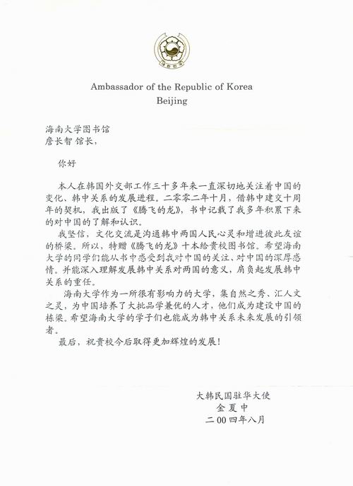 近日,韩国驻华大使金夏中先生把他的著作《腾飞的龙》一书共10册寄赠我校图书馆,并来信祝我校今后取得更加辉煌的发展。