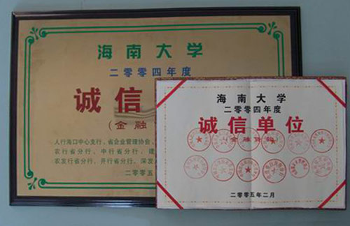 近年来,海南大学的发展日新月异,学校筹集巨资进行大规模建设,这其中也得到了金融机构尤其是省工商银行、省农业银行等机构的大力支持和帮助。海南大学在建设发展过程中,一方面努力增强学校的实力和办学层次,另一方面又特别注重树立诚信海大的形象。此称号的获得,也是社会各界尤其是金融界对海南大学办学成就及未来前景的又一次认可与肯定。