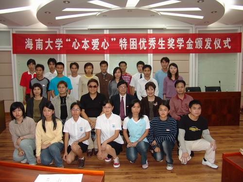 仪式由学生工作处副处长王大群主持,外事侨务处处长华世佳宣读《海南大学关于授予郑维圣等二十同学2005年"心本爱心奖学金"的决定》。随后,郑心本教授与夫人须佑群女士将2万元特困优秀生奖学金亲自颁发给我校20名特困优秀生。获奖学生林斯雄(01级热带果蔬班)代表全体受资助的学生讲话,对郑心本先生的慷慨义举表达了感激之情,同时表示他们将克服困难,发奋学习,将来回报社会。仪式上,郑心本教授发表了一番感人肺腑的讲话,他讲述了当年自己在海外打工求学的经历,勉励同学们奋发向上,不要屈服于贫困,同时表示愿意全力帮助有志到国外深造的学子。最后,校党委书记赵康太教授发表讲话,对来宾的到访表示热烈的欢迎并对郑心本教授关心家乡教育事业、支持海大学术交流及资助特困优秀生的义举表示衷心的感谢。