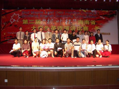 4月13日晚,第二届“枫叶杯”海南省大学生英语演讲比赛决赛在我校办公楼大报告厅隆重举行,此次演讲比赛的主题是“加中建交35周年之际,加拿大总理保罗.马丁先生于2005年1月访问中国对加中两国关系的进一步发展有何深远意义?”。