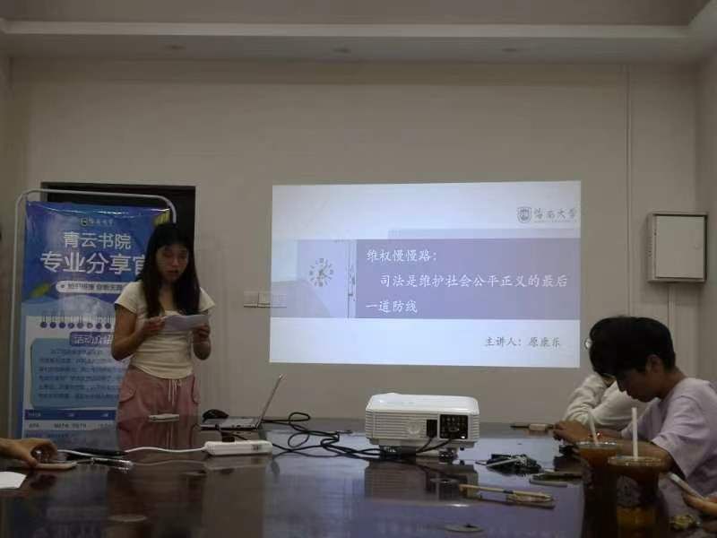 2024年4月13日下午3时,由海南大学青云书院举办的“专业分享官”系列学术交流活动在农科楼西附北楼219教室举行,这次的主题为“知法于心,守法于行”。