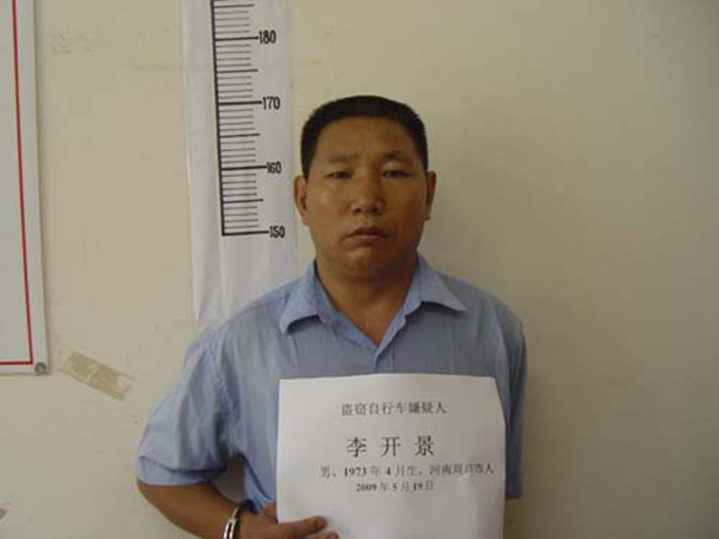 2009年5月19日上午9时20分许,我处干警正在2号教学楼附近进行埋伏,突然发现一形迹可疑男子鬼鬼祟祟从2号教学楼出来,掏出作案工具将一辆红银间色奥斯卡品牌赛车盗得。此时,我处干警迅速出击将其抓获现形,并其身上搜出大量作案工具。经查,作案嫌疑人李开景,男,1973年4月出生,河南周口市人;对其偷窃自行车的事实供认不讳。