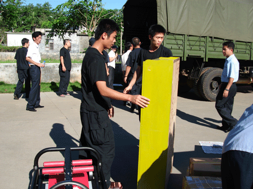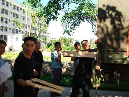 此次搬迁工作得到了海口市公安局和海南武警总队的大力支持,市局侯亨浪副书记亲自批示,海南交警总队蔡军副总队长亲自布置,市局交巡警支队派出警车1辆全程护送,车队进入海口辖区后派出警力12名保证道路畅通。海南武警总队后勤基地派出运输车辆13辆协助搬迁。