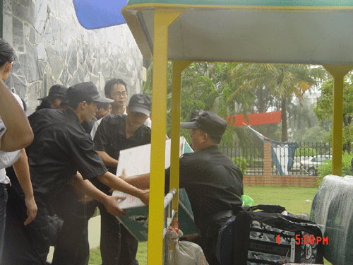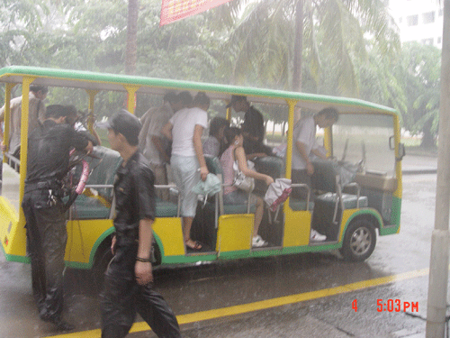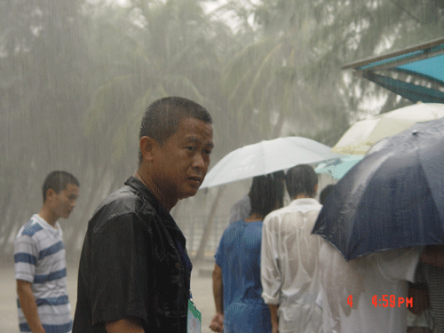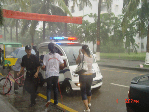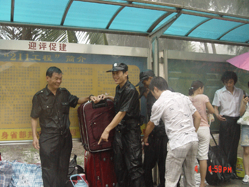 2007年9月4日下午四时许,我校儋州校区第二次师生搬迁车队顺利到达海甸校区,正当大家兴高采烈帮忙新来的同学搬运行李的时候,天公却不作美,瞬间阴云密布,暴雨说来就来。眼看着那么多同学们堆放在校道上的行李就要面临被淋湿的可能。为了尽可能的减少同学们的财产损失,保卫处全体干警及校卫队员不畏风雨,在青年志愿者的协助下,继续在暴雨中组织车辆把同学的行李转移到安全的地方,然后又将同学们的财产进行归类,分送到同学们所在的楼管处,确保了同学们财产安全。在战斗中有的同志鞋子泡坏了,手机被淋坏了,但他们全然不顾,