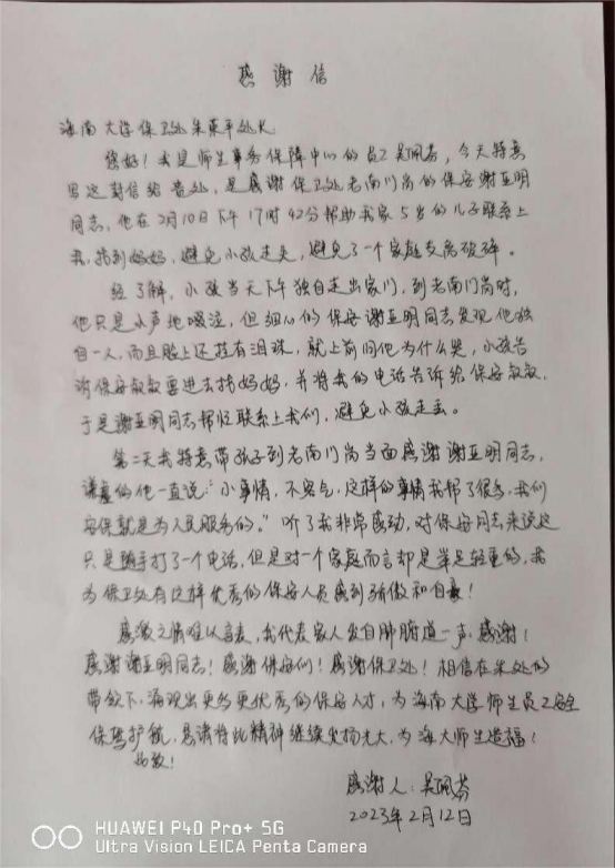 中金鹰安保公司驻海南大学海甸校区安保人员谢亚明同志在工作中认真负责,善于发现问题,主动热心帮助他人,2023 年 2 月 10日在老南门岗执勤时细心发现小男孩与家人走失,主动帮助小男孩联系家人,避免意外事故发生,得到了家人的感谢并致感谢信到保卫处。