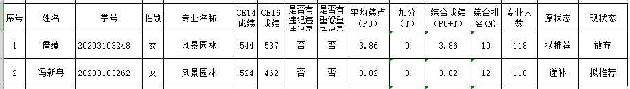 因风景园林专业有一名学生主动放弃推免资格,在专业内按替补顺序推荐,现对调整后的推免生候选人名单予以公示,具体见下表。