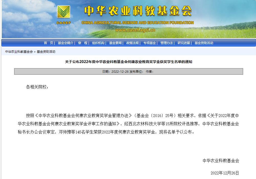 关于公布2022年度中华农业科教基金会何康农业教育奖学金获奖学生名单的通知
