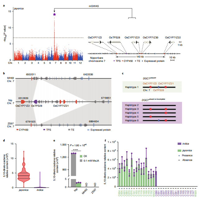 该研究利用水稻自然群体进行代谢物全基因组关联分析(mGWAS),在水稻7号染色体成功定位、并结合酵母微粒体、烟草瞬时表达及转基因等手段鉴定了一个控制单环二萜自然变异的基因簇DGC7。该基因簇由1个萜烯合成酶及2个CYP450酶组成,在质体中催化形成5,10-二酮-蓖麻烯(5,10-diketo-casbene),一种具有潜在医用价值的重要二萜。