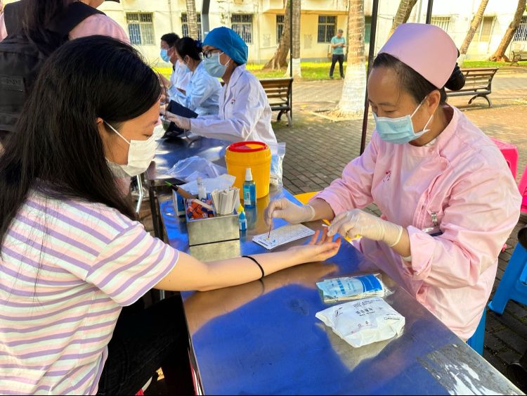 在活动的现场,还有来自海南大学的学生志愿者们,在此次义诊活动的现场发放无偿献血、“2+3”健康服务包的相关宣传资料,向高校学子宣传无偿献血理念、普及“2+3”健康服务包知识。